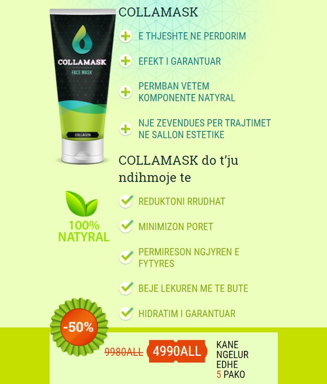 Collamask Shqiperi do të bëjë lëkurën tuaj shumë të rinj, sipërfaqe dhe të thellë rrudhave janë zbutur, qëndrueshmëri të lëkurës dhe elasticitet rritet. Maska rivendosni ngjyrën, thellësisht moisturize, të qetë dhe të forcojë lëkurën. Rregullimi i qarkullimit të gjakut, rritja e funksioneve mbrojtëse të lëkurës së fytyrës, janë një burim i fuqishëm i hidratimit të lëkurës. Maska nuk shkakton acarim të lëkurës, rivendos dhe ushqen lëkurën.