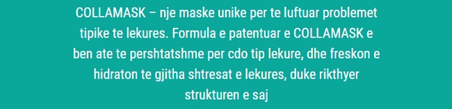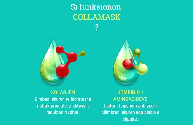 Collamask Albania kthimin e elasticitetit të lëkurës, ka një efekt lifting , ushqyes dhe hidratues atë. Lëkura është transformuar brenda natës, është rigjeneruar në mënyrë aktive për shkak të koncentrimit të lëndëve ushqyese . Ajo ka theksuar shërimin, rigjenerimin, rinovimin dhe vetitë mbrojtëse. Pas aplikimit të maskës në thellësitë e matricës dermal , fillon sinteza aktive e kolagjenit dhe shfaqet një efekt i fuqishëm antioksidant , qelizat e dëmtuara të lëkurës dhe fibroblastet janë restauruar.